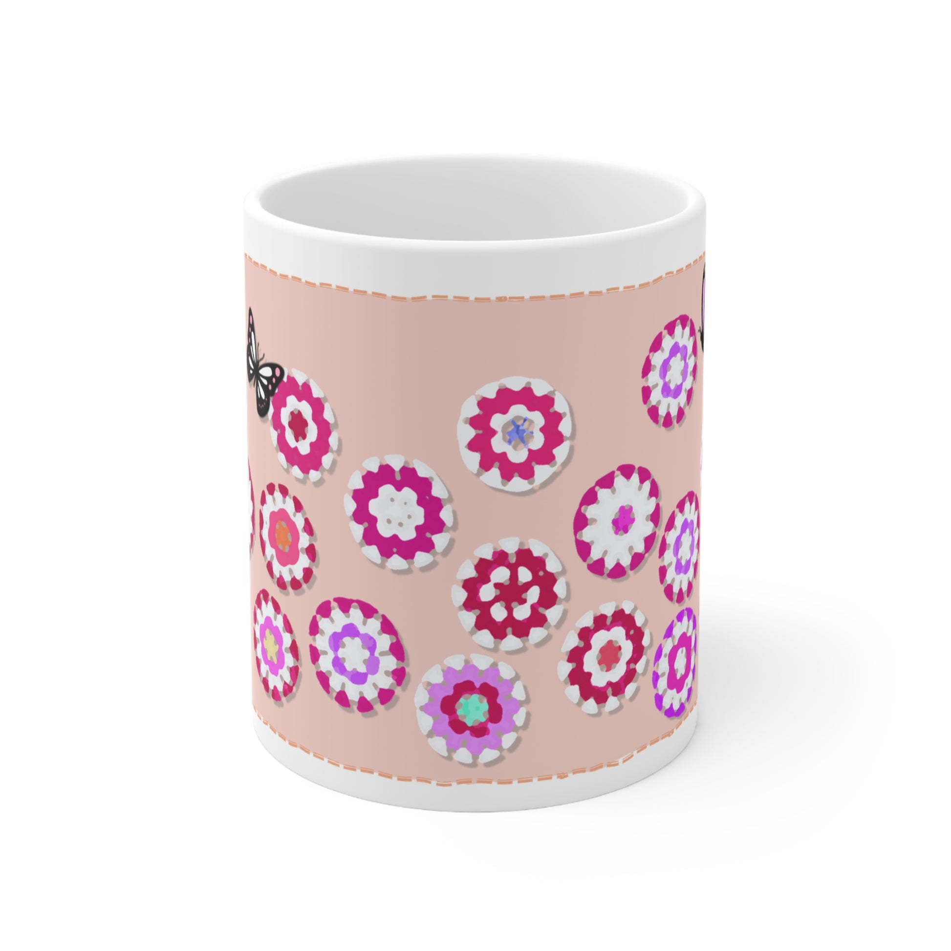 Coffee Mug Design Image - Red Crochet Pattern on Peach Colour Background
